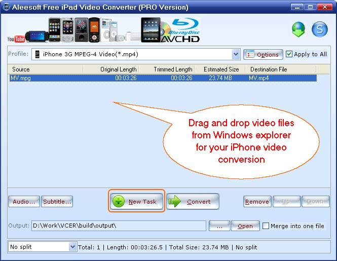 Aleesoft Free iPad Video Converter is an iPhone video converter, 100% clean (No Viruses, No Adware, No Spyware). This video to iPhone converter can help you convert video to iPhone including iPhone, iPhone 3G, iPhone 3Gs, then let you enjoy video and music on your iPhone.